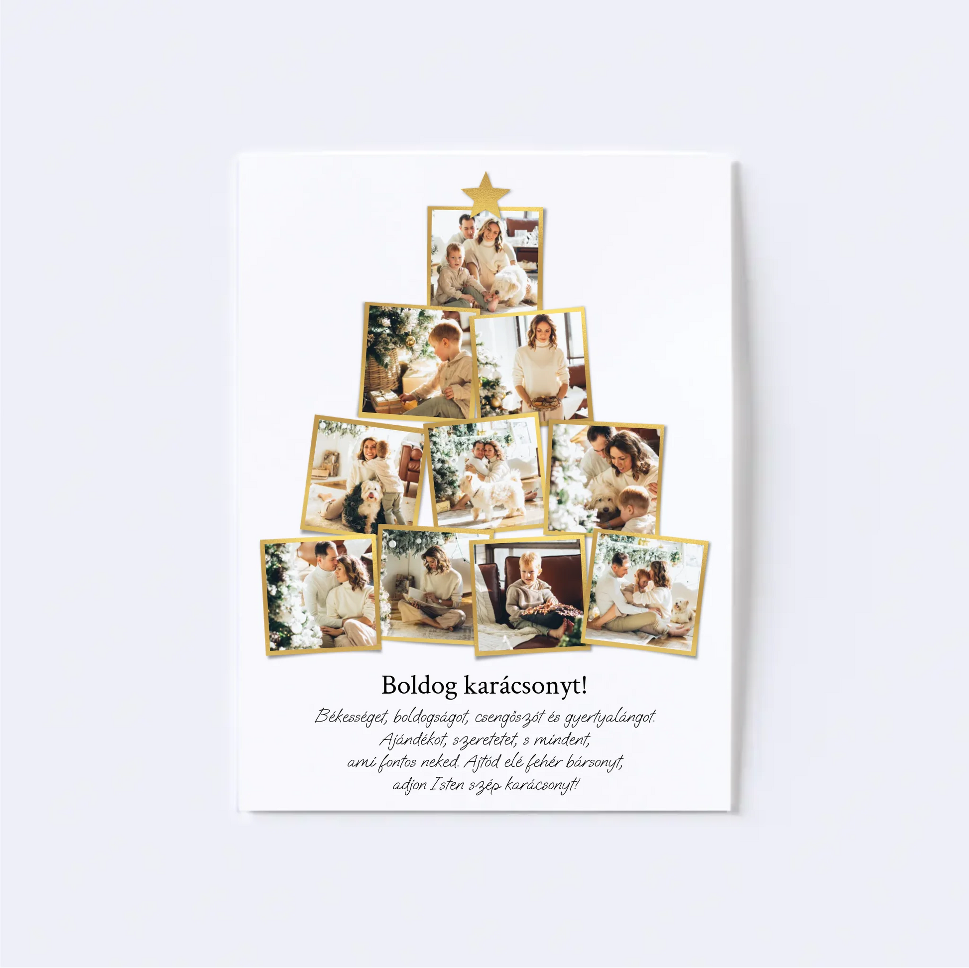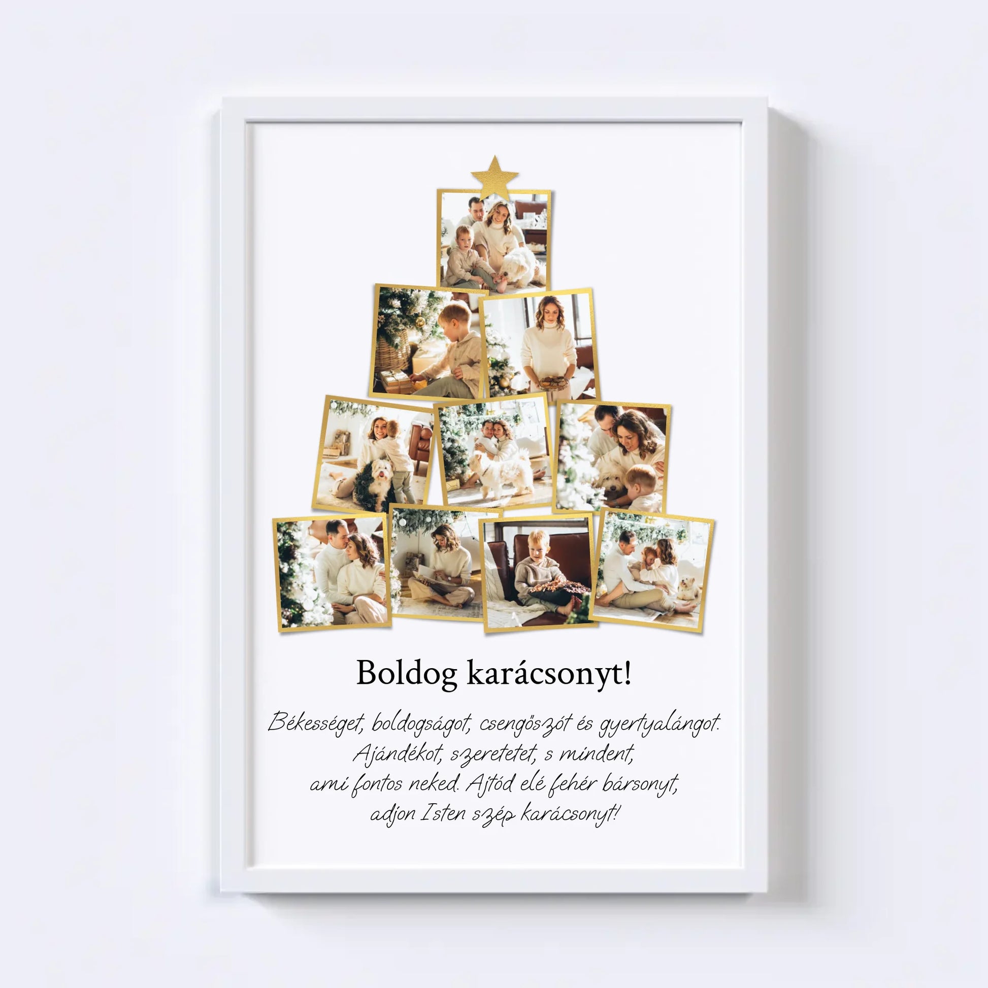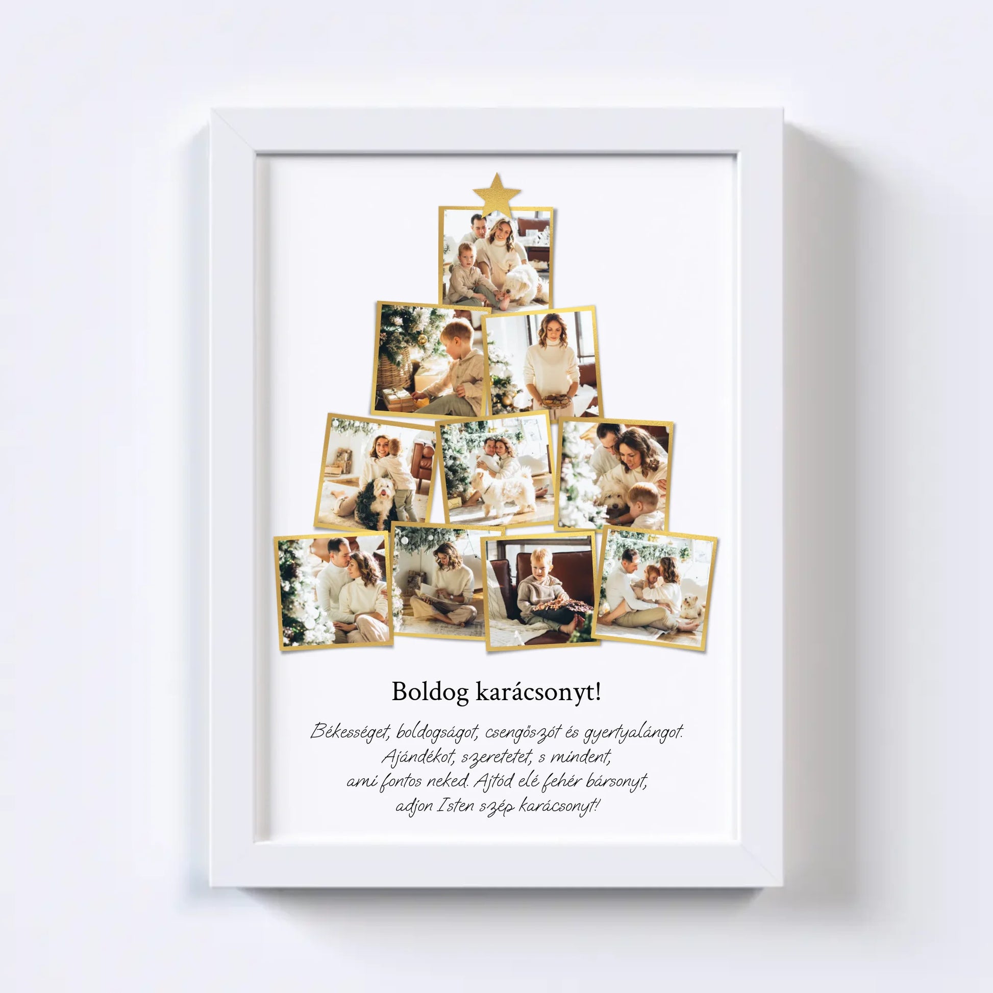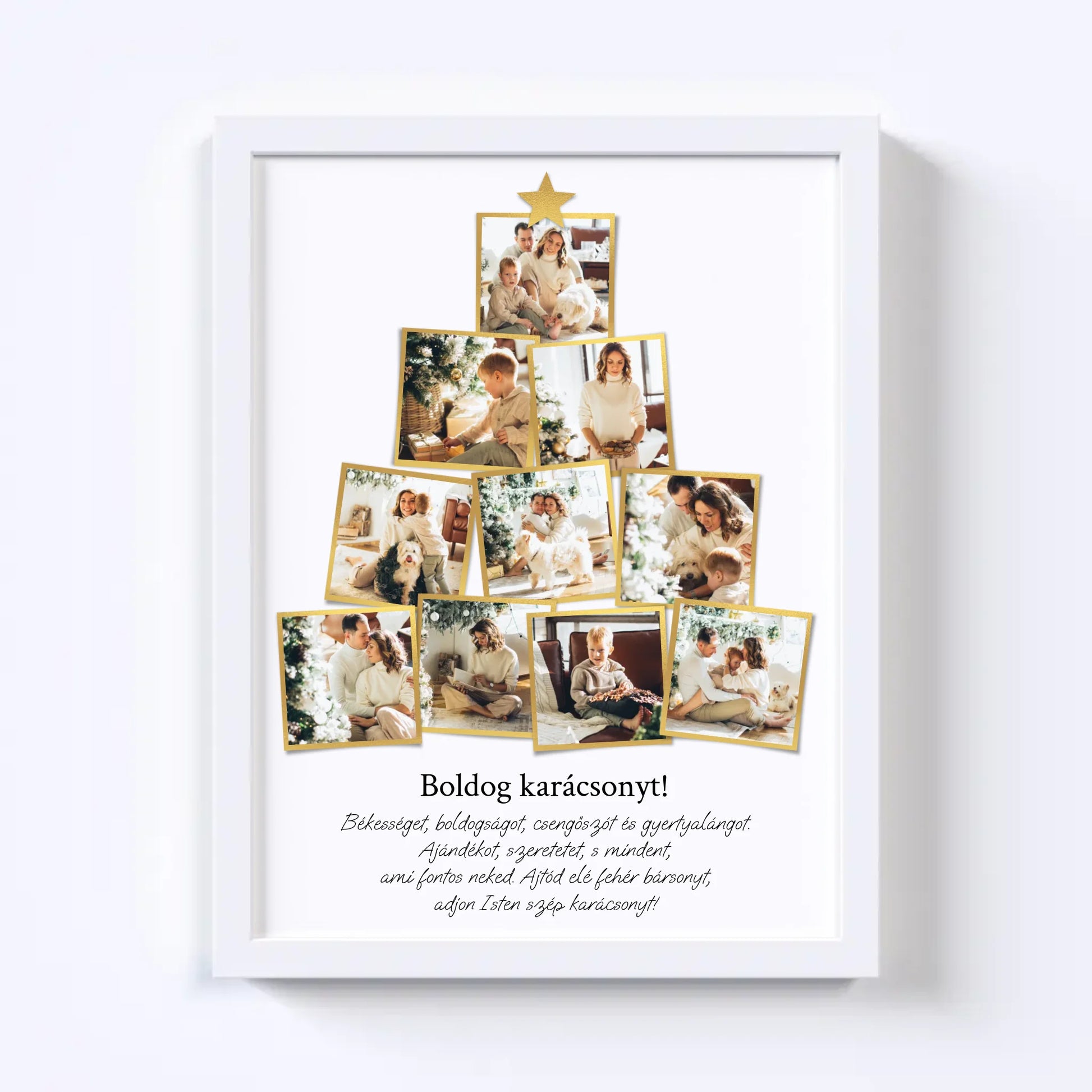 Tedd felejthetetlenné az ünnepeket egy karácsonyfa alakú fotókollázzsal, amelybe 10 kedvenc képed kerülhet. Egyedi és szívhez szóló ajándék szeretteidnek, amely ünnepi dekorációként is meghitt hangulatot teremt.