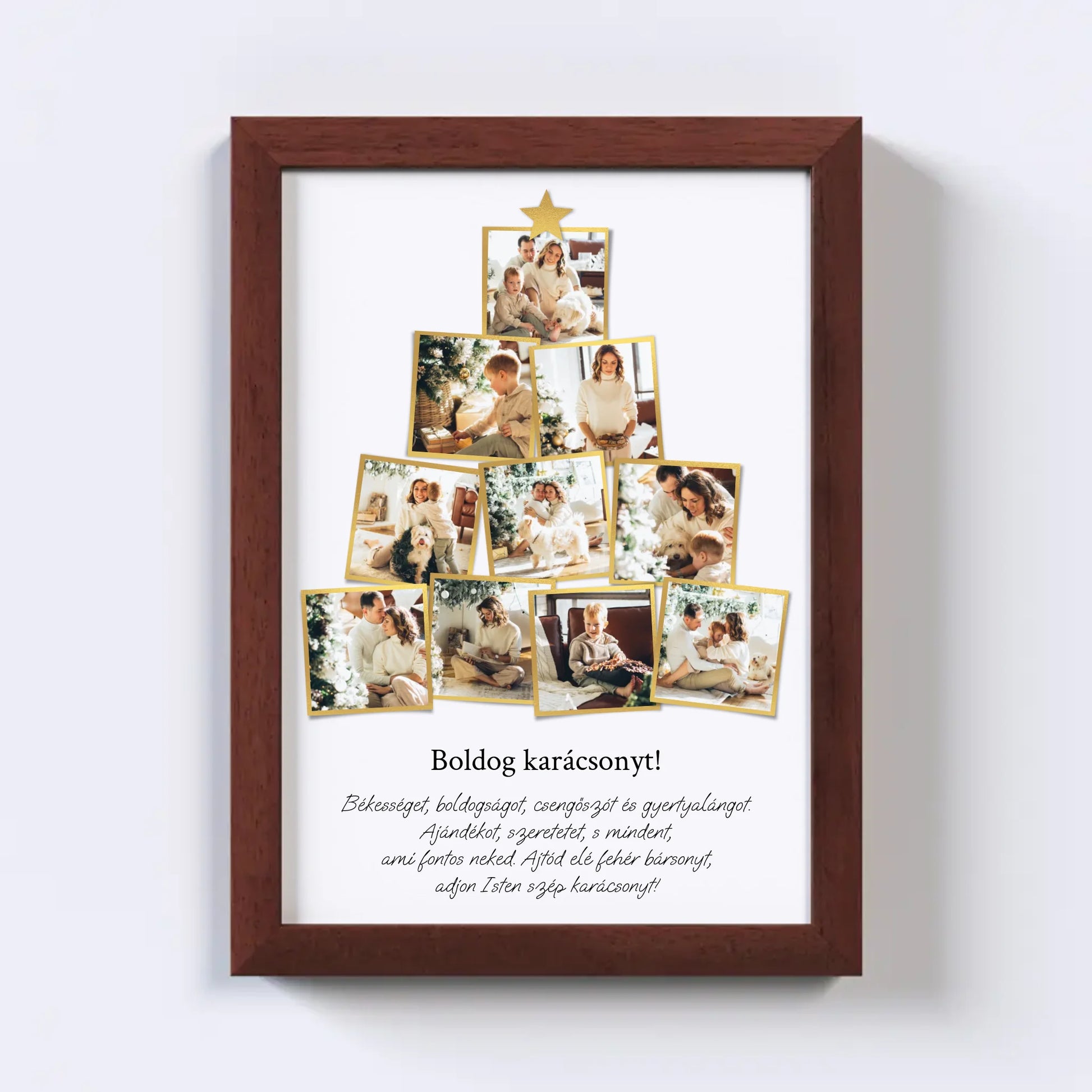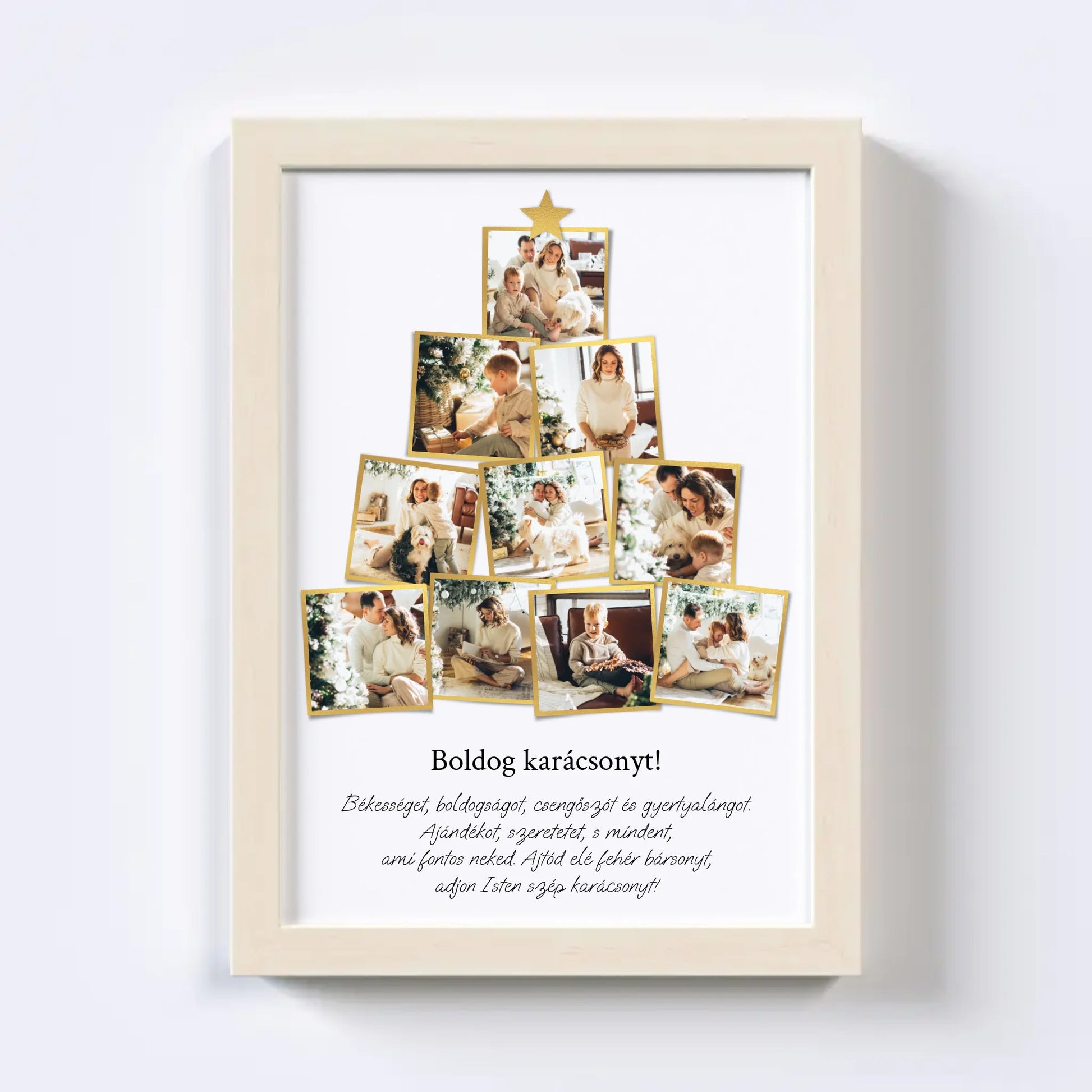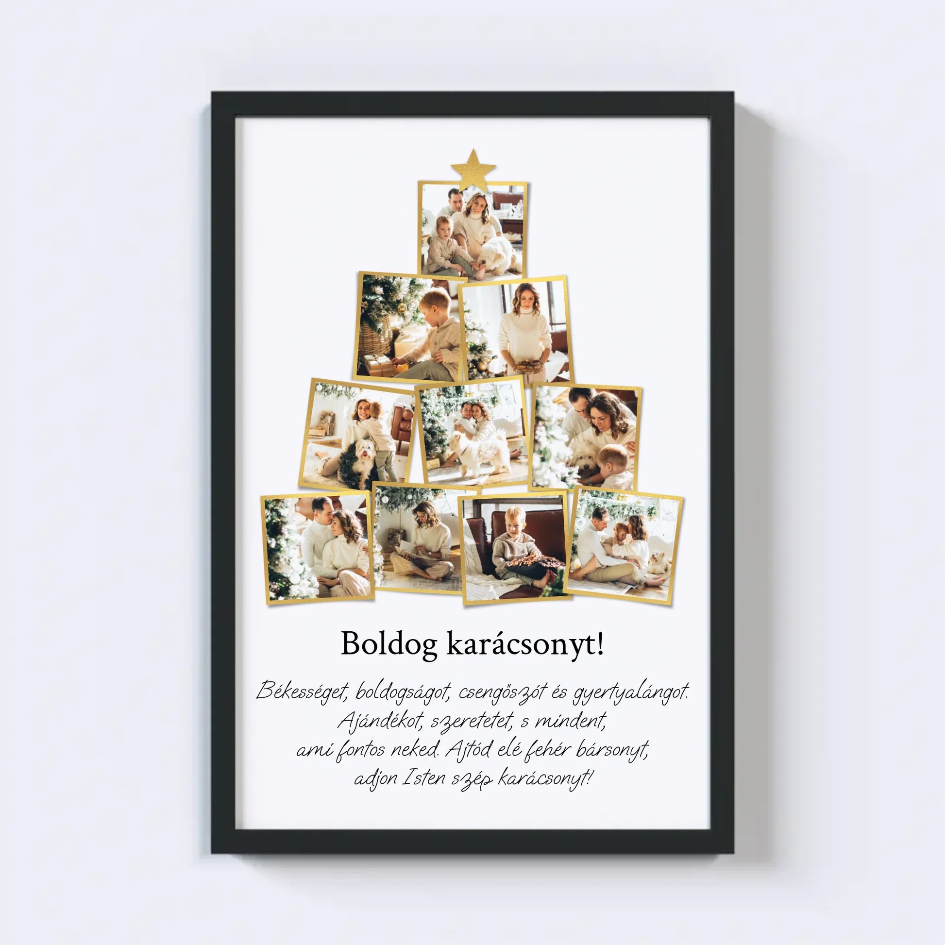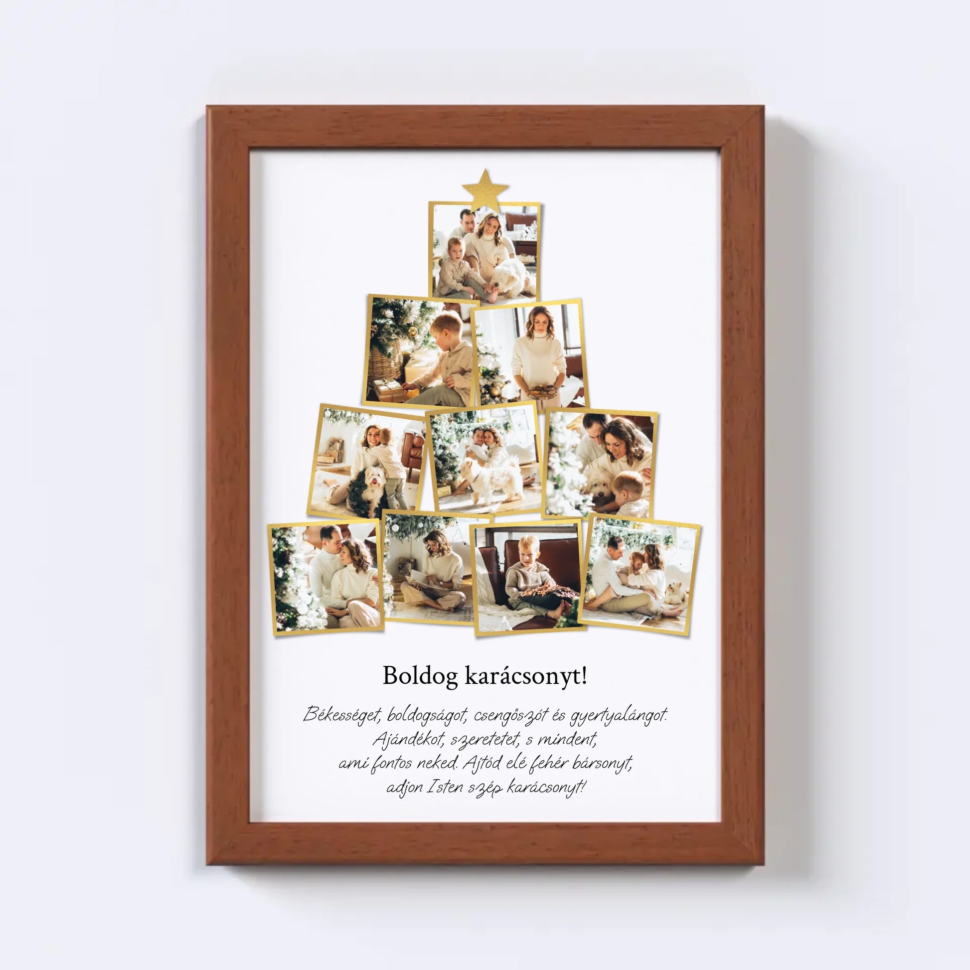 Tedd felejthetetlenné az ünnepeket egy karácsonyfa alakú fotókollázzsal, amelybe 10 kedvenc képed kerülhet. Egyedi és szívhez szóló ajándék szeretteidnek, amely ünnepi dekorációként is meghitt hangulatot teremt.