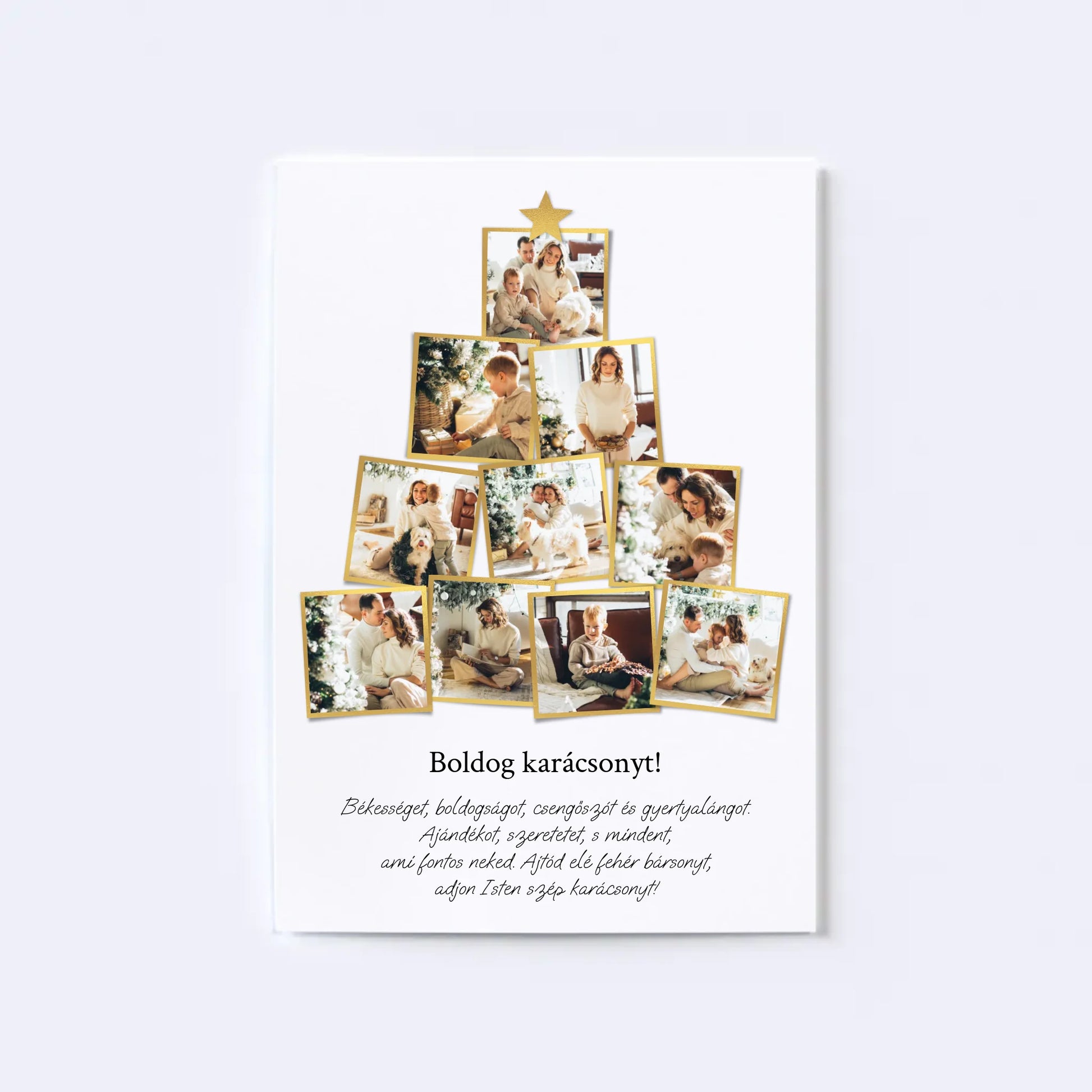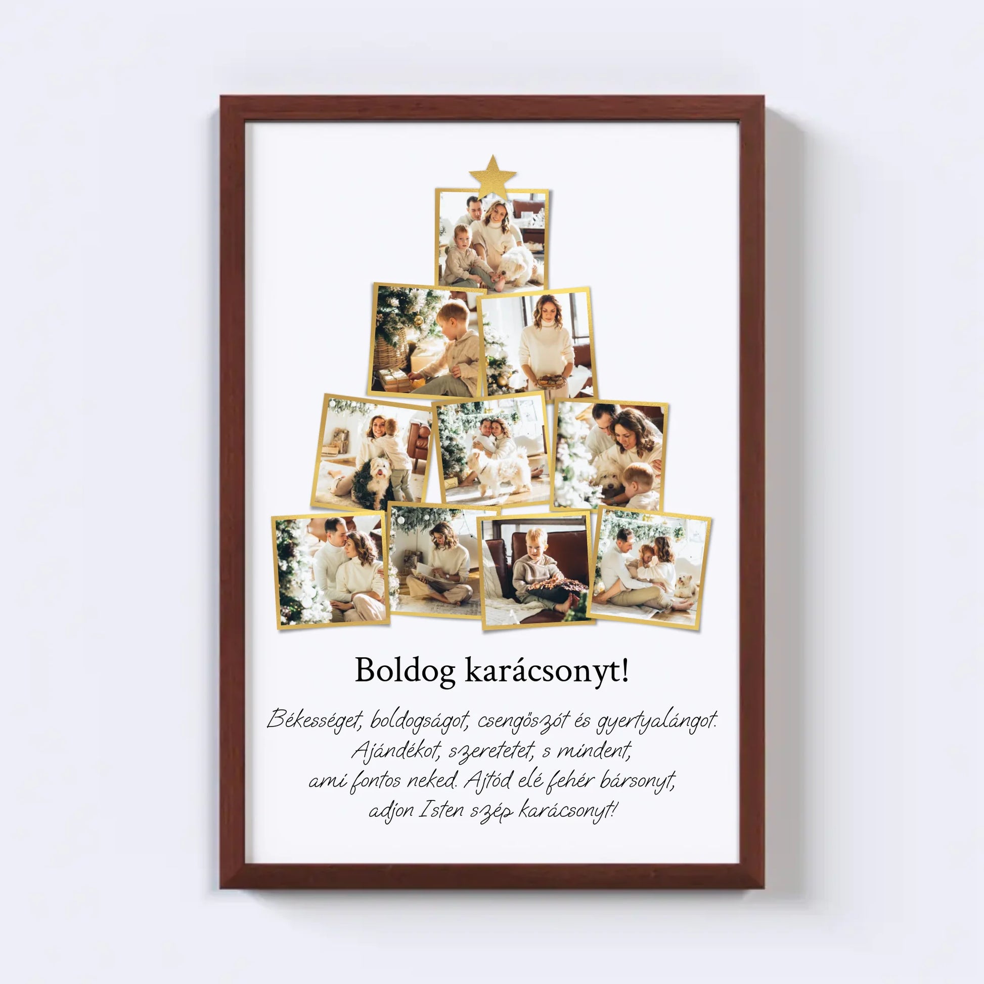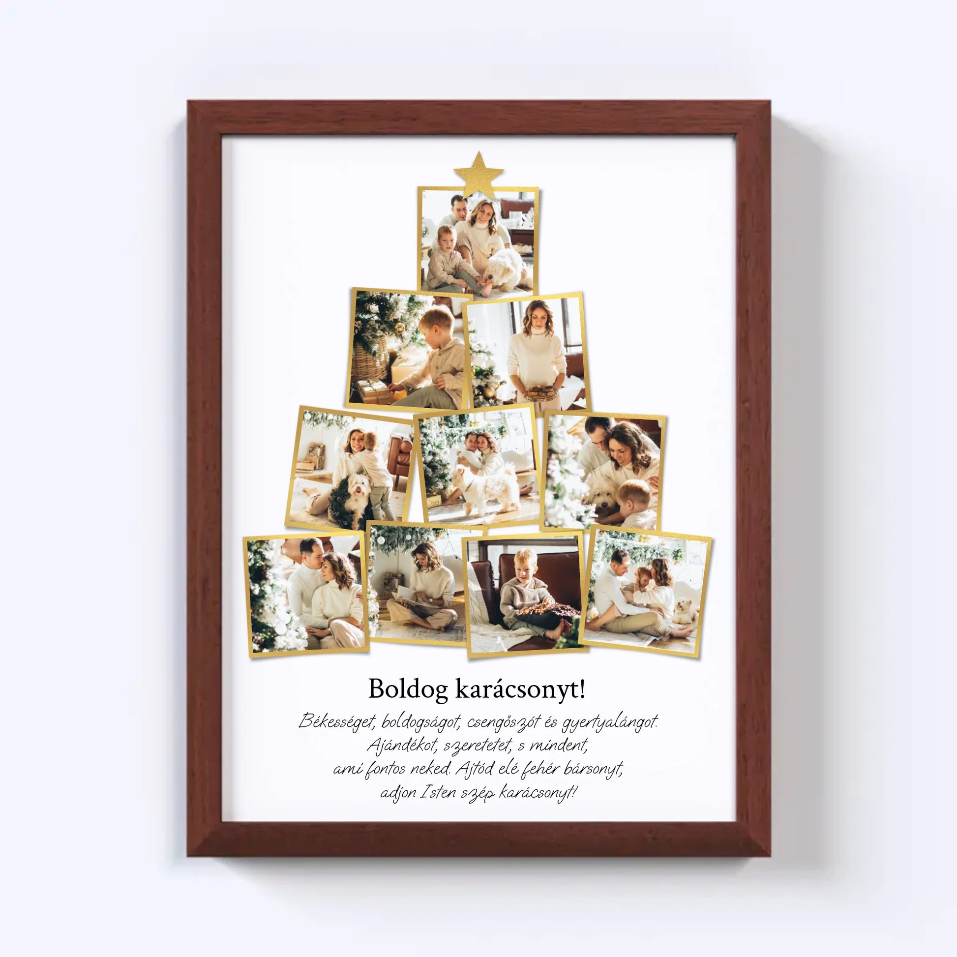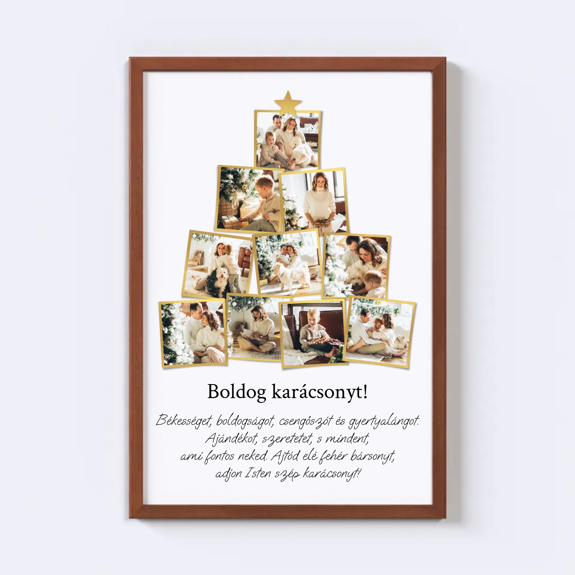 Tedd felejthetetlenné az ünnepeket egy karácsonyfa alakú fotókollázzsal, amelybe 10 kedvenc képed kerülhet. Egyedi és szívhez szóló ajándék szeretteidnek, amely ünnepi dekorációként is meghitt hangulatot teremt.