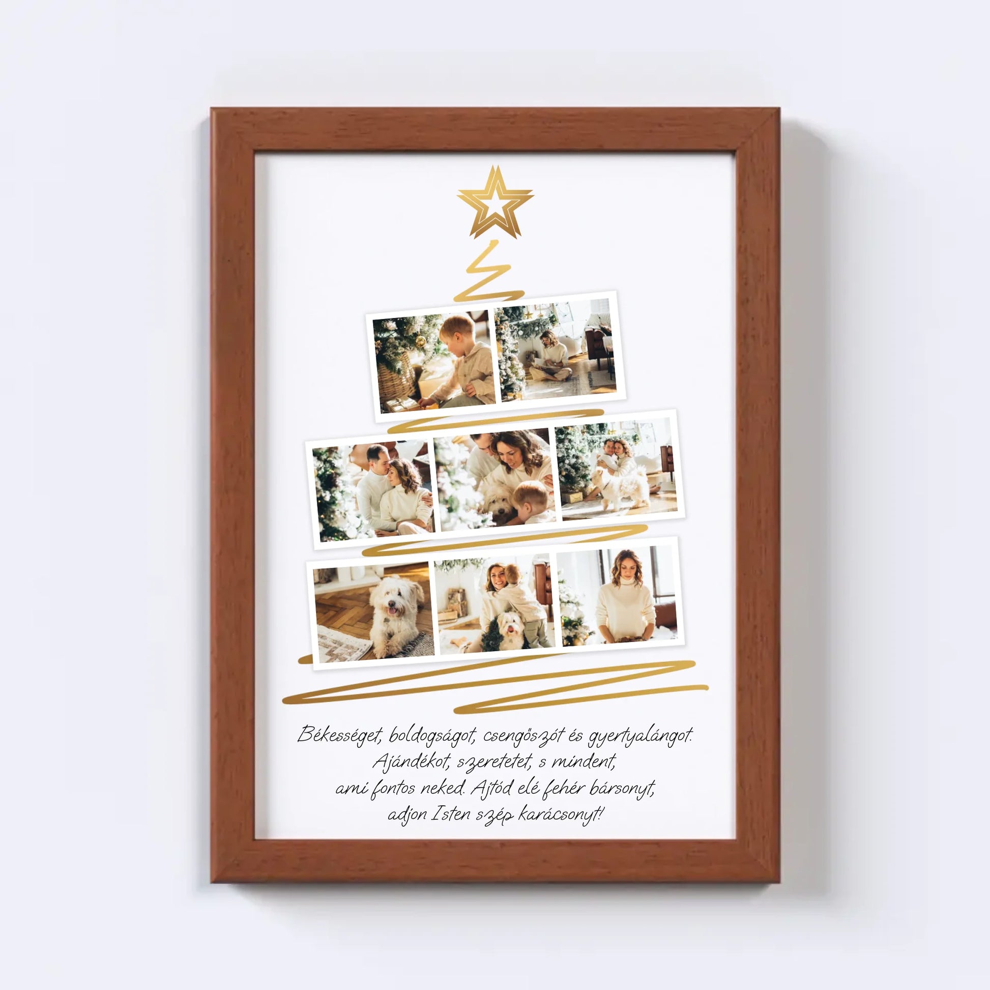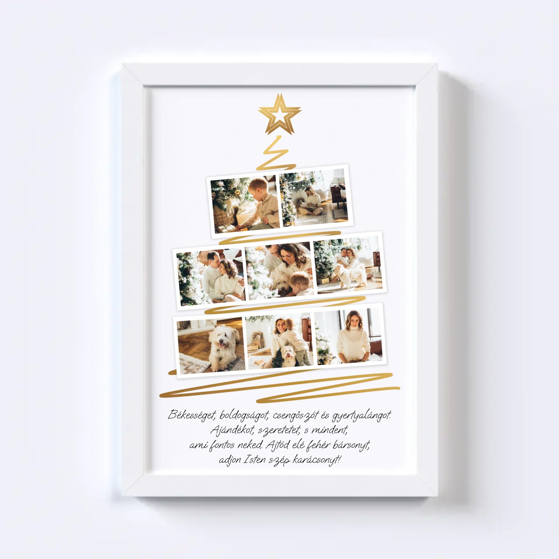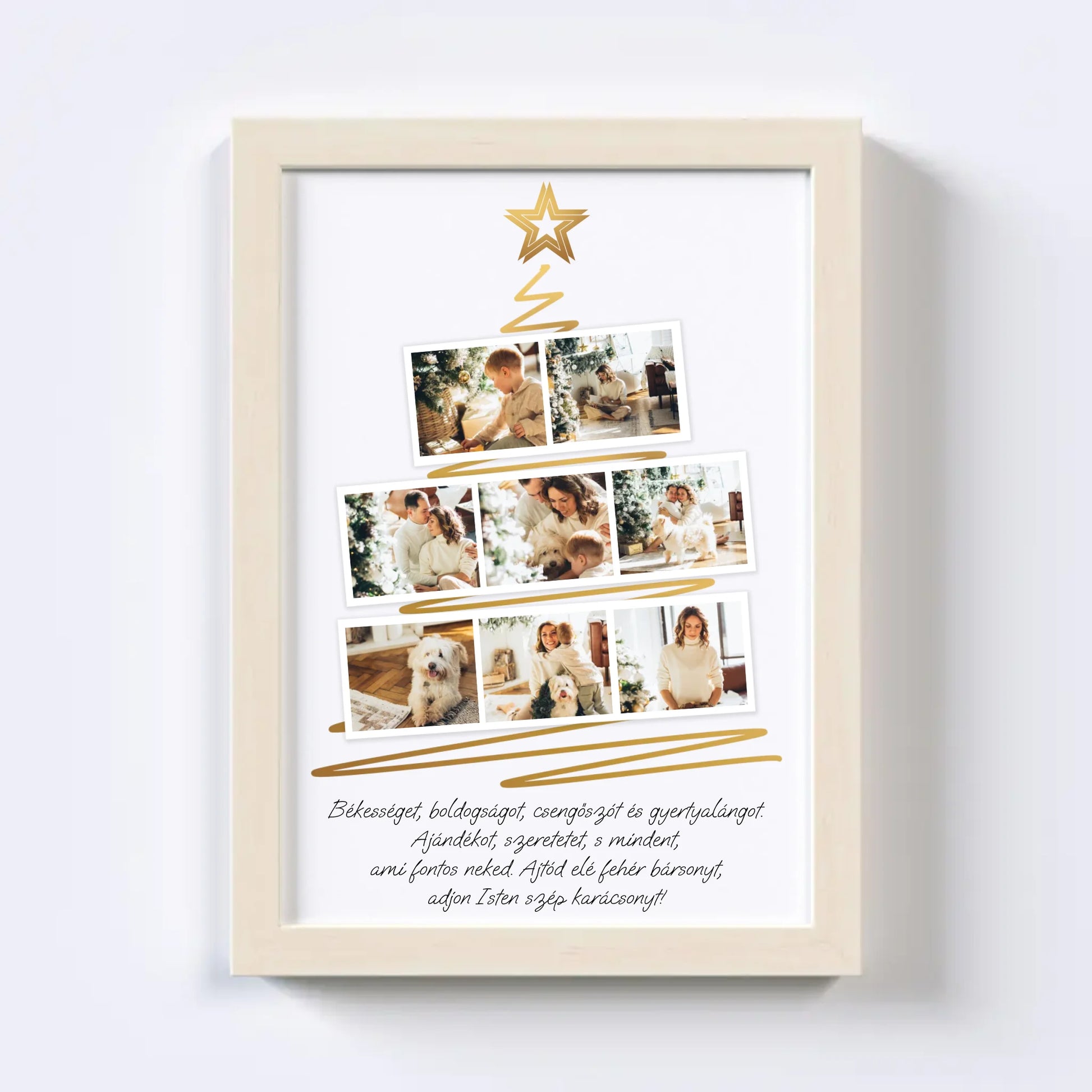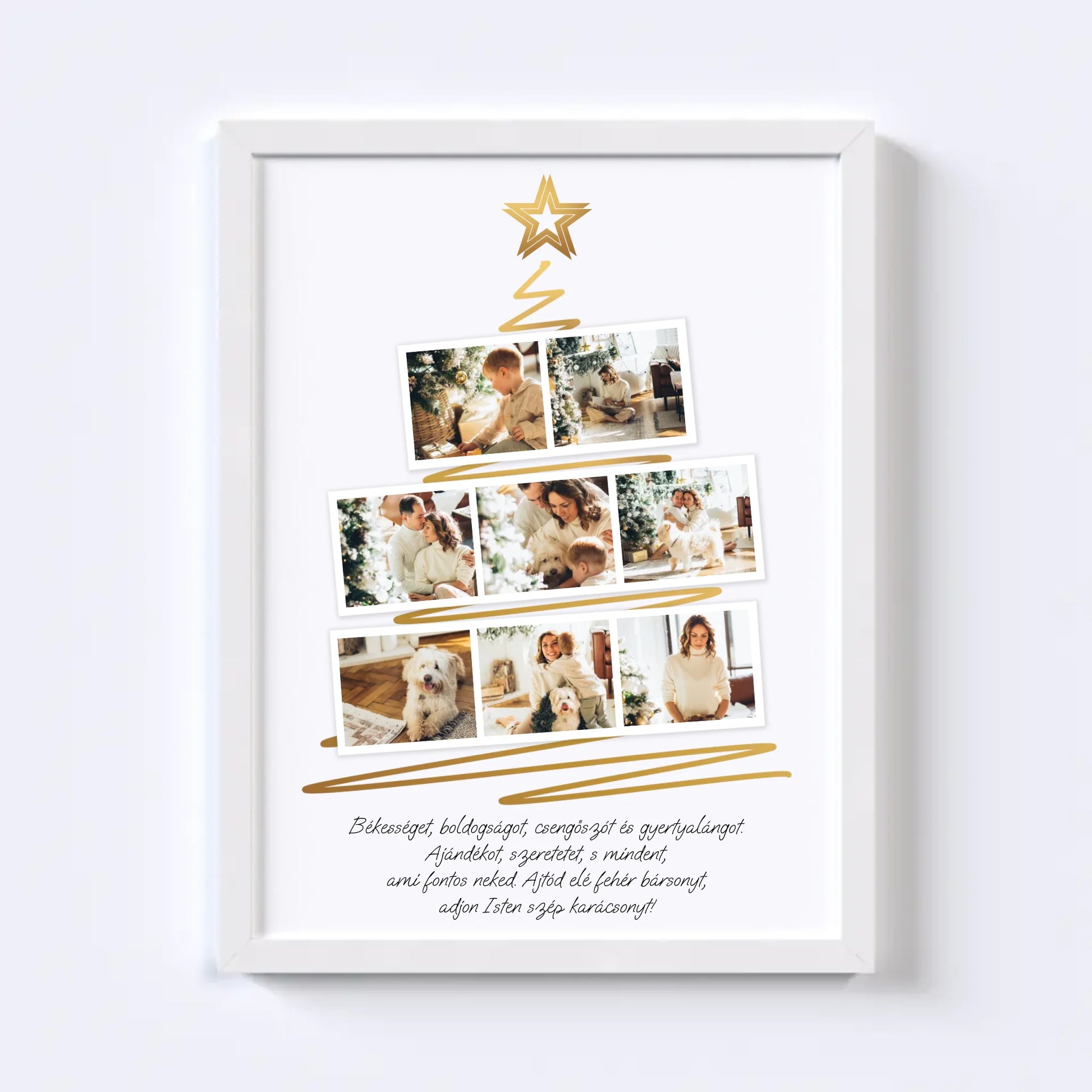 Karácsonyfa alakú fotókollázs, amelybe 8 kedvenc fotód tölthető fel. Egyedi és meghitt ajándék a szeretteidnek, amely különleges ünnepi hangulatot teremt. Tökéletes választás ajándéknak és dekorációnak egyaránt.
