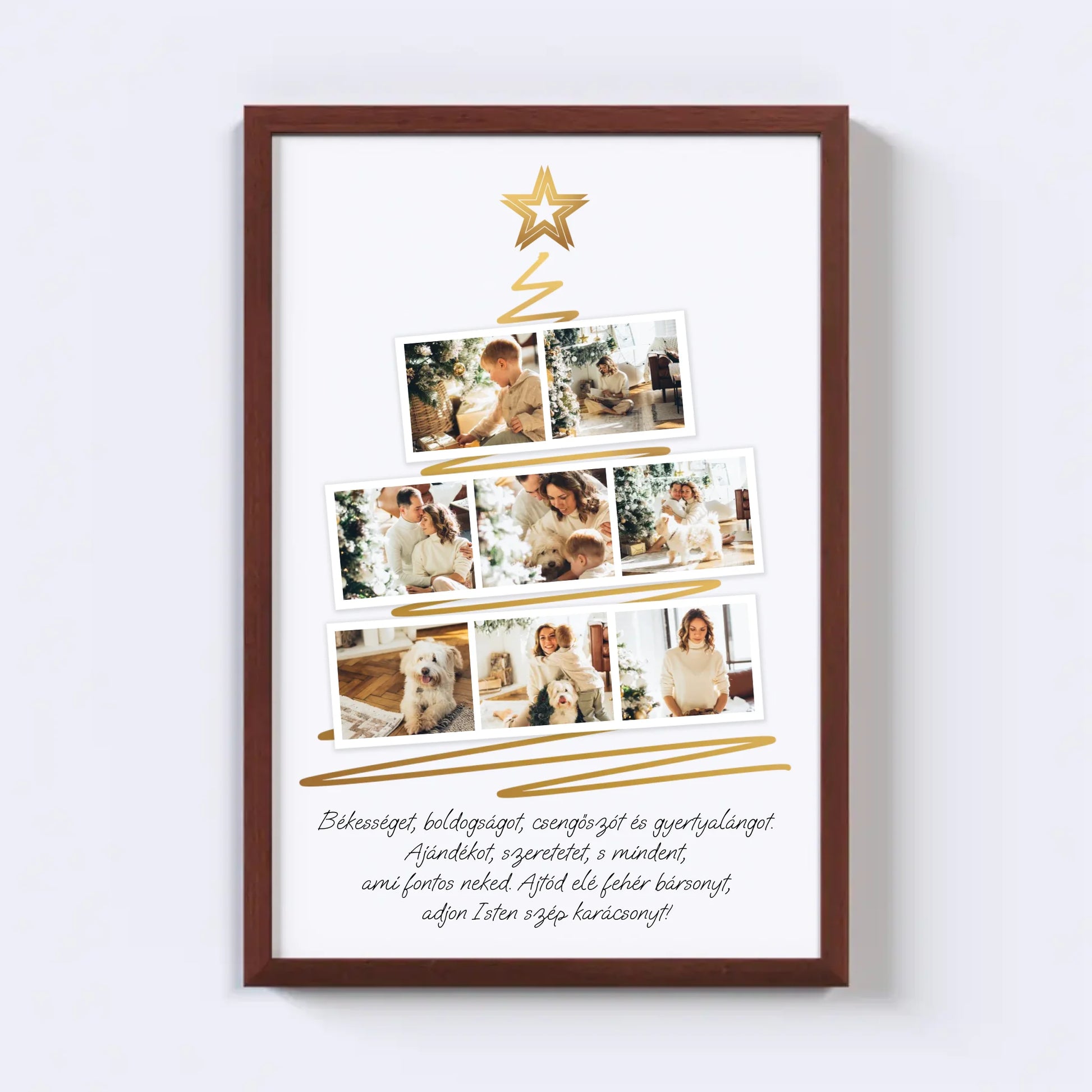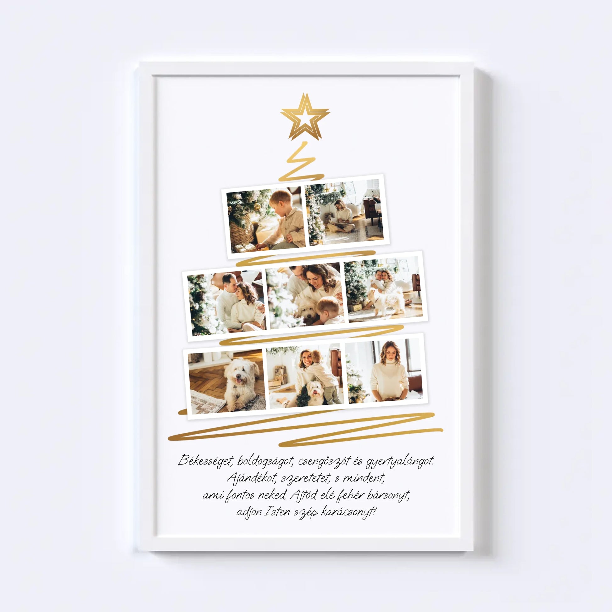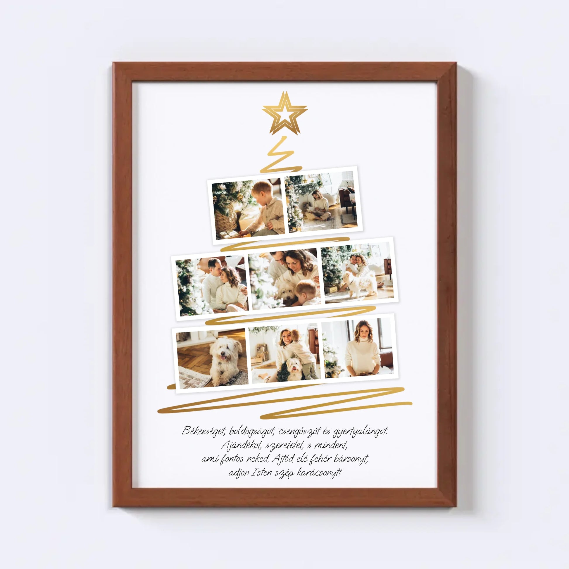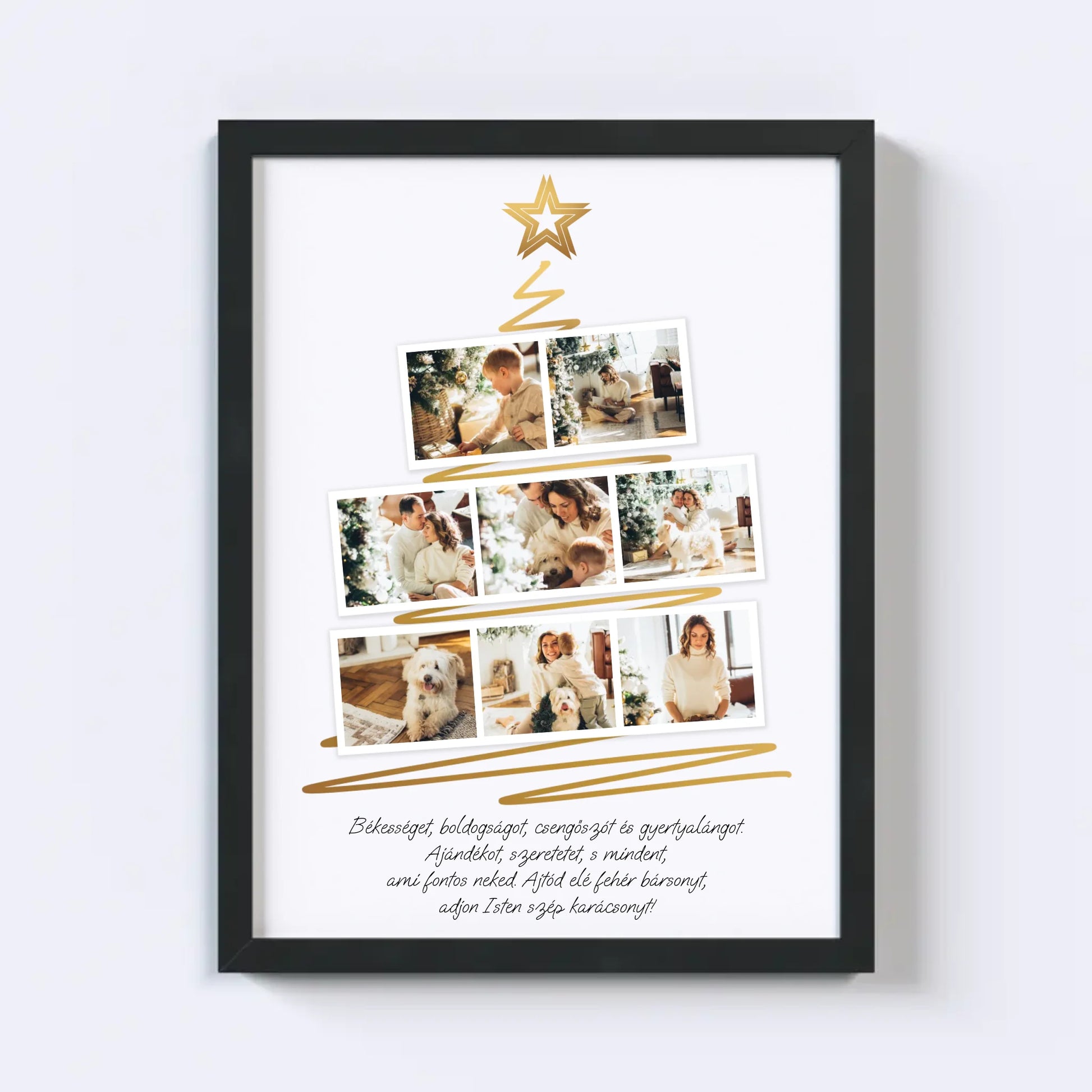 Karácsonyfa alakú fotókollázs, amelybe 8 kedvenc fotód tölthető fel. Egyedi és meghitt ajándék a szeretteidnek, amely különleges ünnepi hangulatot teremt. Tökéletes választás ajándéknak és dekorációnak egyaránt.