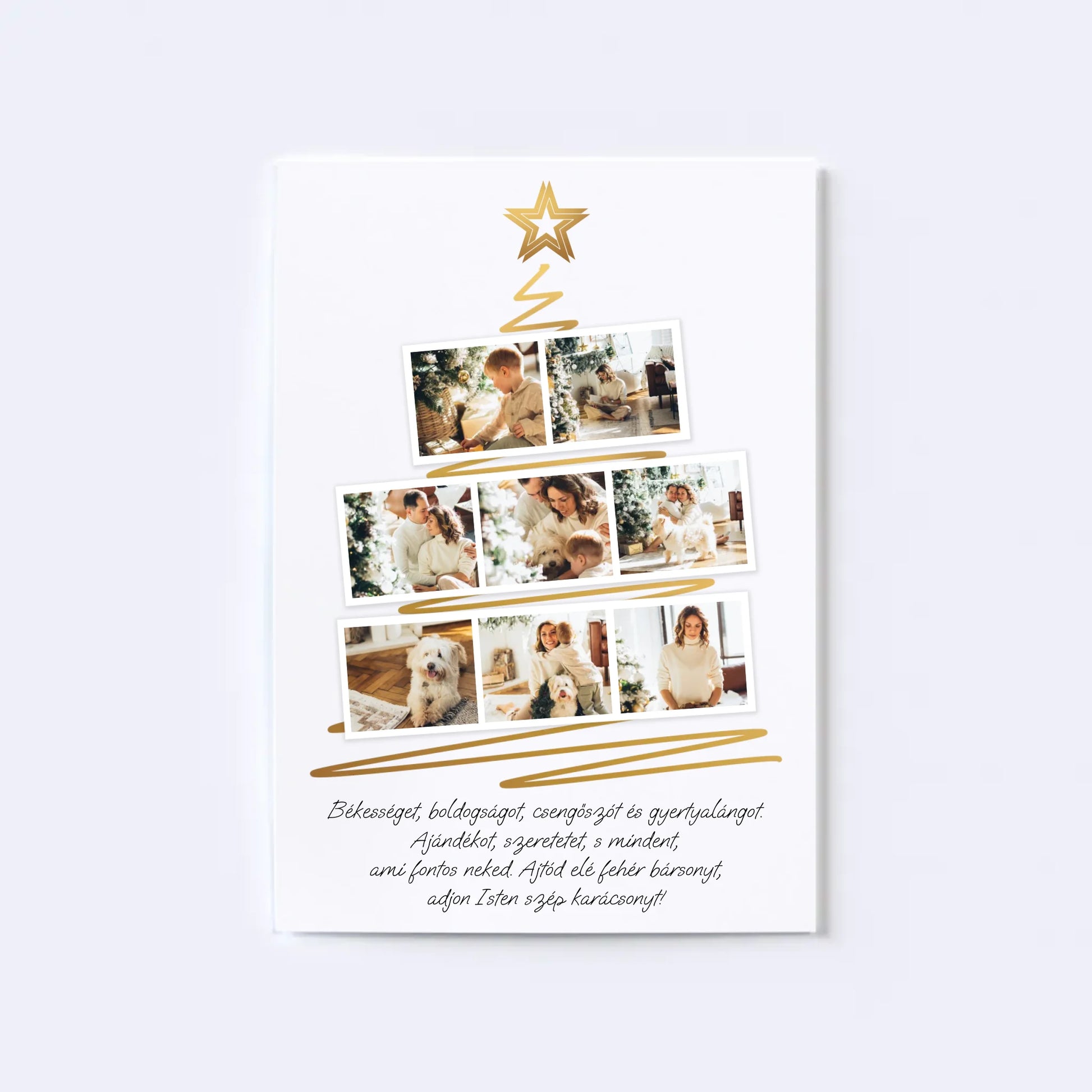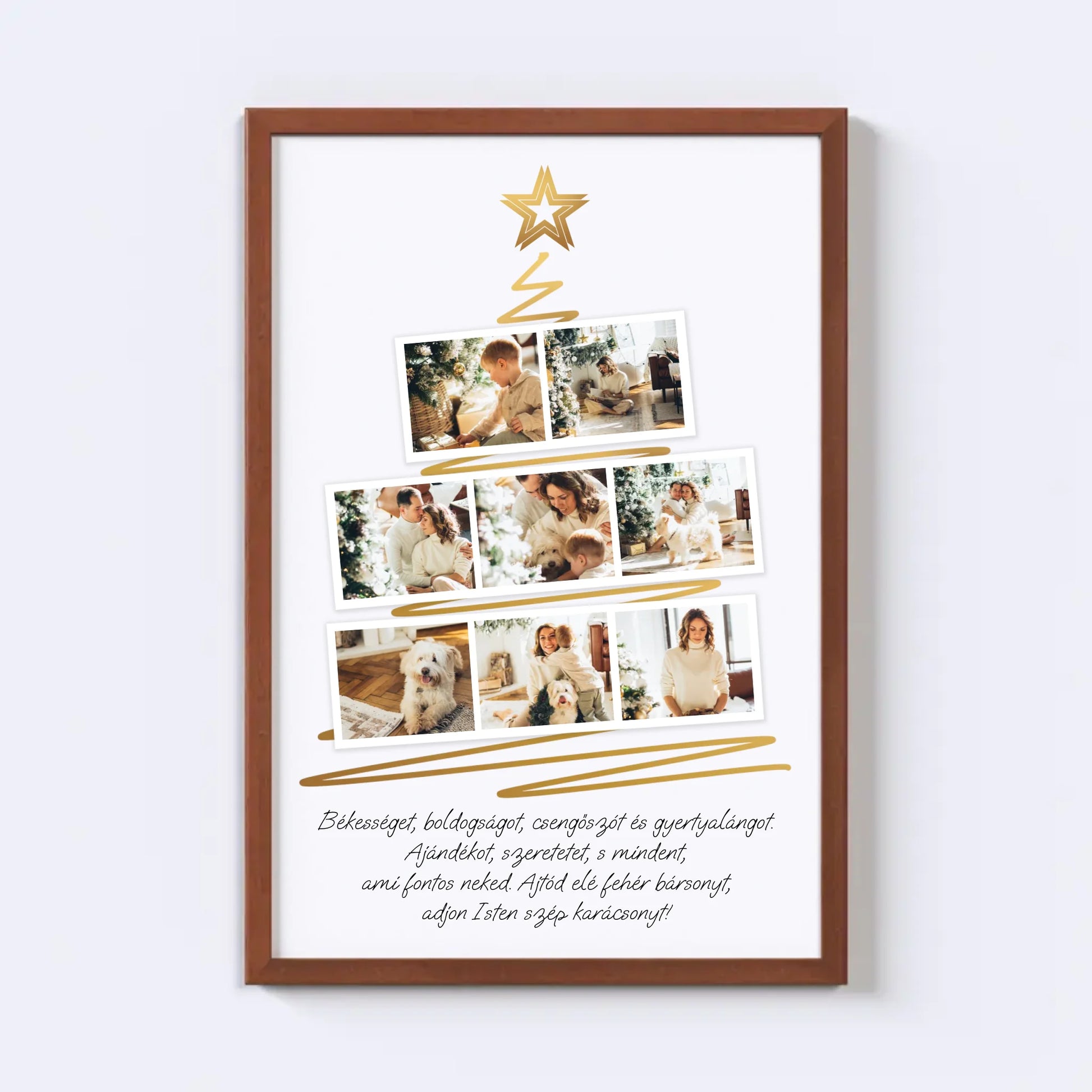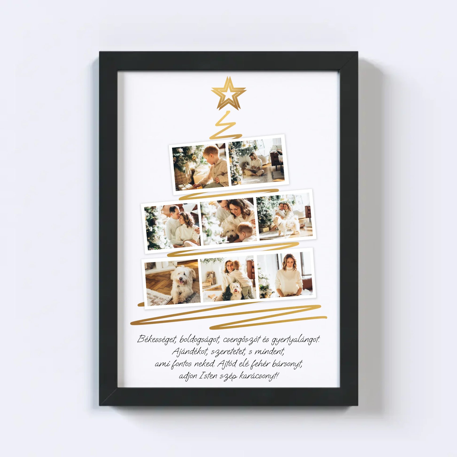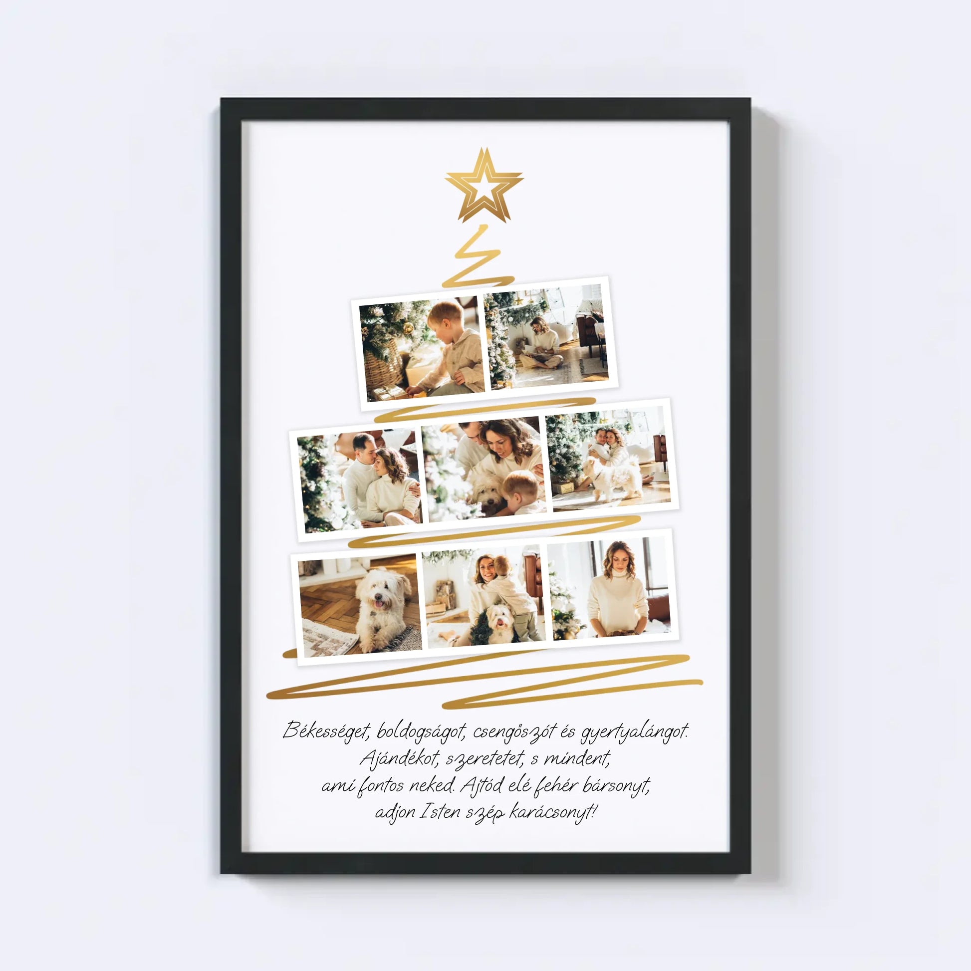 Karácsonyfa alakú fotókollázs, amelybe 8 kedvenc fotód tölthető fel. Egyedi és meghitt ajándék a szeretteidnek, amely különleges ünnepi hangulatot teremt. Tökéletes választás ajándéknak és dekorációnak egyaránt.